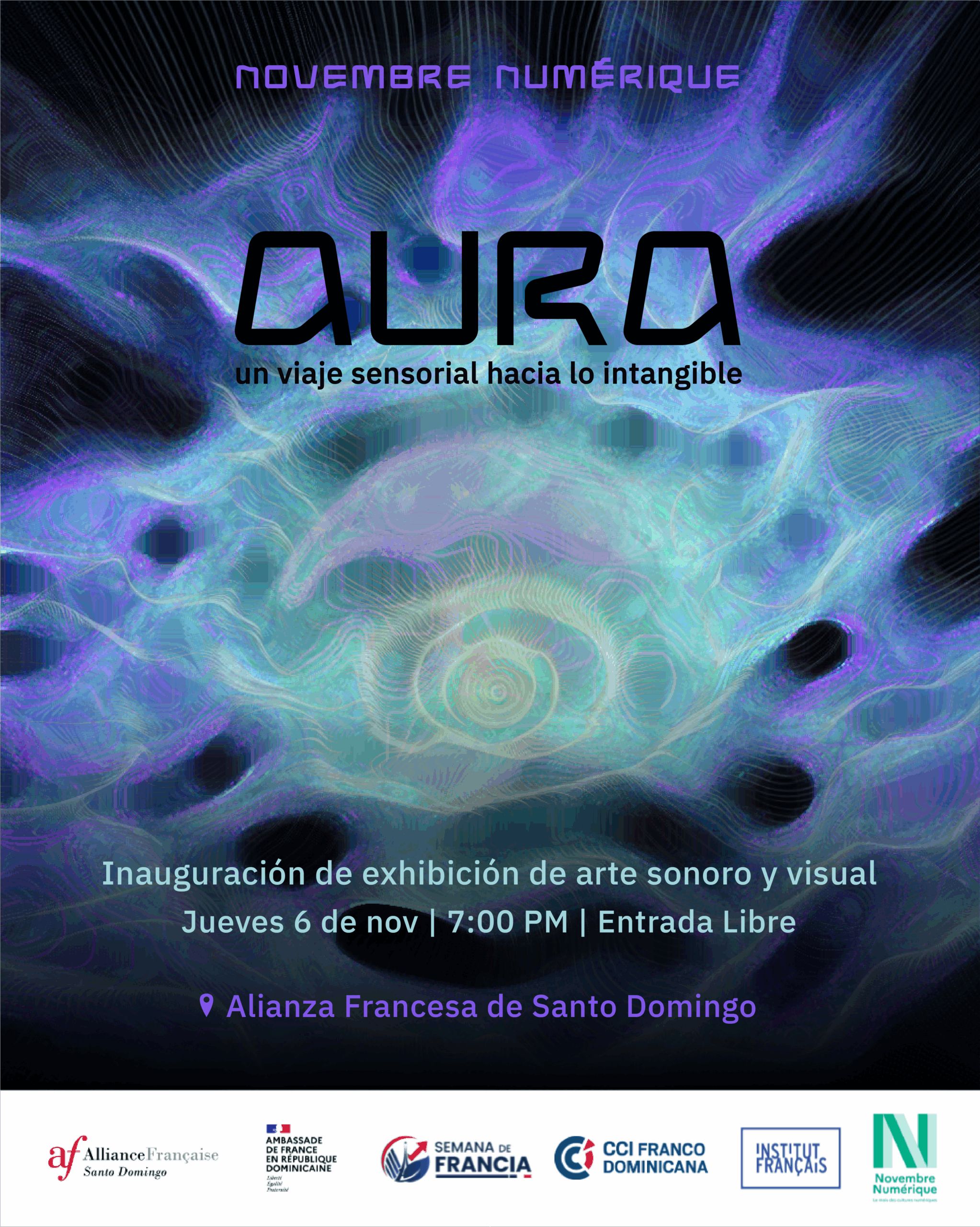 Inspirada en artistas de vanguardia franceses como Tarek Atoui y Cécile Babiole, así como en experiencias inmersivas como L’expérience Sensorielle de la Cité des Sciences et de l’Industrie de París, AURA se articula en torno a creación sonora, experiencia inmersiva e investigación interdisciplinaria. Concebida por un colectivo de artistas dominicanos, la exposición integra perspectivas de psicología cognitiva, biología y física para explorar las conexiones humanas y su relación con el tiempo, el espacio y lo intangible.